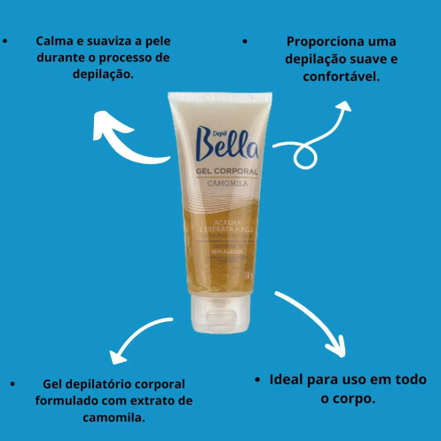 Gel corporal calmante com camomila, perfeito para aliviar a pele após a depilação, deixando-a hidratada e refrescada.