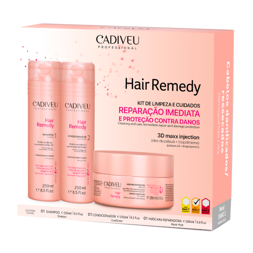 Embalagem: Shampoo 250ml, Condicionador 250ml, Máscara 250g.