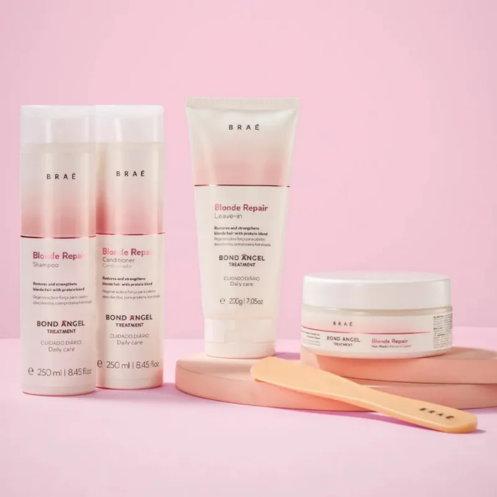 O Leave-in Braé Bond Angel Blonde Repair foi criado para proporcionar um cuidado especial e atender às necessidades únicas desses fios, Sua composição apresenta uma afinidade excepcional com o cabelo e inclui Proteína do Trigo Hidrolisada, que assegura uma absorção eficaz do tratamento. Além disso, bloqueia a umidade e combate o frizz, ao mesmo tempo em que oferece proteção térmica contra fontes de calor. Combinado com óleos nutritivos, proporciona reposição lipídica, suavidade e brilho.