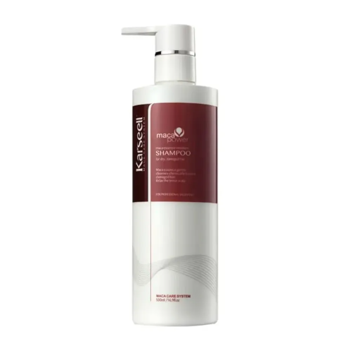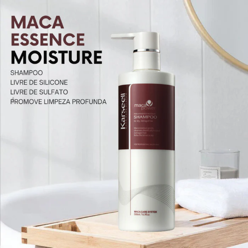 O Shampoo Karseel Maca Essence Repair limpa suavemente enquanto trata os fios danificados.